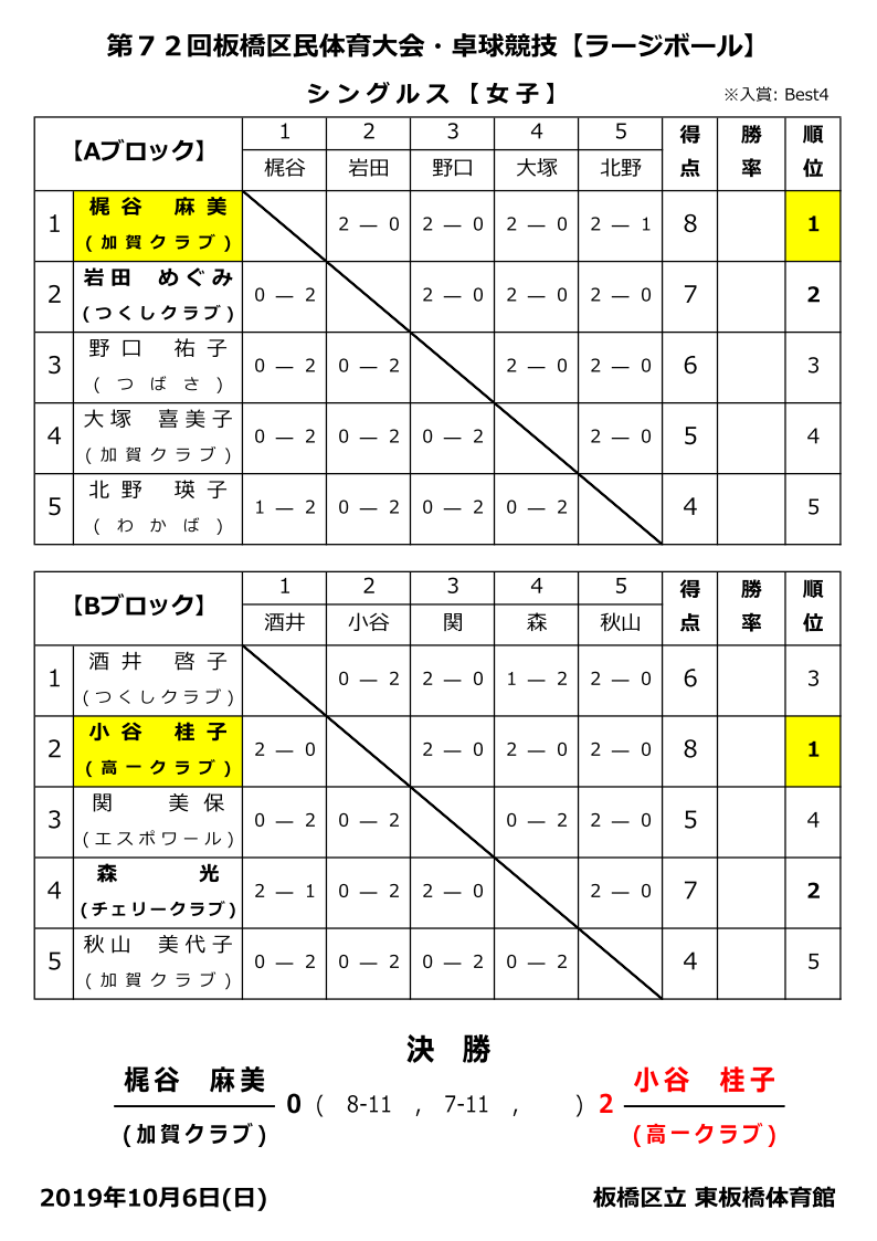 第72回区民体育大会卓球競技(ラージボール)女子シングルス結果